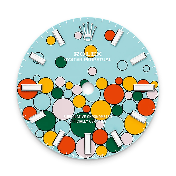 The Oyster Perpetual provides a clear and accurate time display – hours, minutes and seconds. The different versions of the watch stands out with dials in various colours, subtle or vibrant: a range of different faces, always sporting a contemporary look. From beige, lavender or pistachio matt lacquer, to candy rose, green, turquoise blue, black or med blue lacquer or sunray-finish silver, they match any style. The Oyster Perpetual comes in five sizes – 28, 31, 34, 36 and 41 mm – providing the largest choice of diameters for a Rolex range.